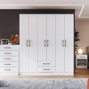 Con una altura de 181 cm, este clóset ofrece amplio espacio para colgar tus prendas en sus 6 puertas con barrales incluidos. Además, cuenta con 2 cajones espaciosos para guardar tus objetos más pequeños y mantener todo en orden.