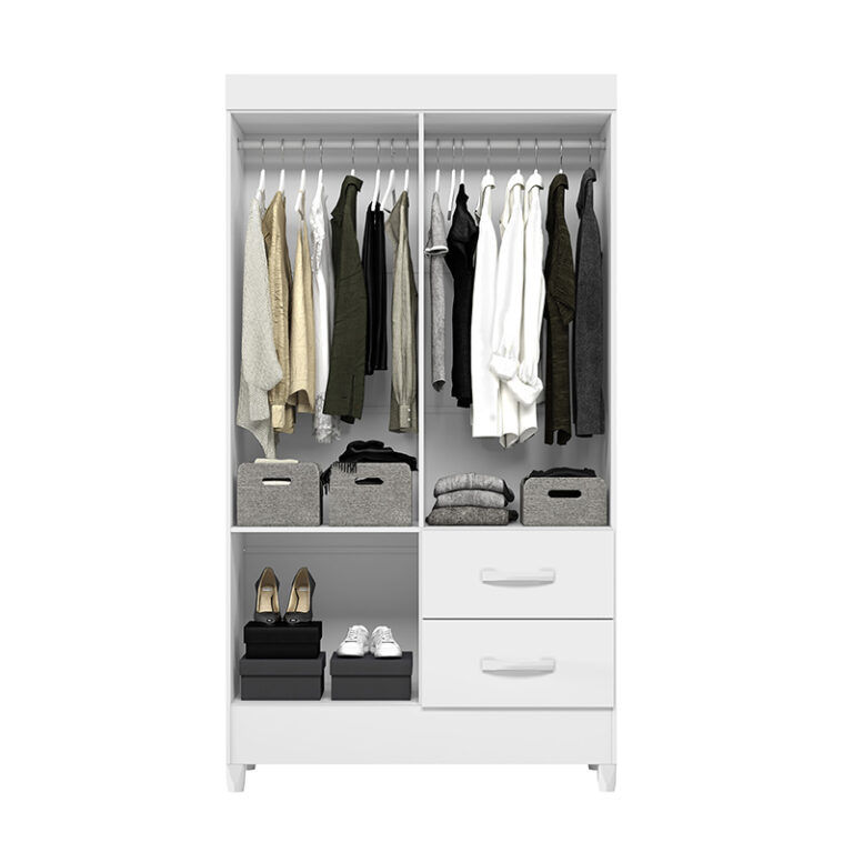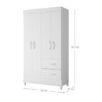 Closet fabricado en aglomerado MDP con terminación en pintura UV. Posee 4 puertas y 2 cajones y en su interior 2 barras para colgar, además de un espacio para zapatos. Incluye 4 patas que le dan altura y además facilitan la limpieza del piso, de tamaño ideal y estilo sofisticado para mantener en orden tu dormitorio.