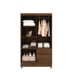 Este modelo incluye dos cajones que ofrecen un espacio adicional para mantener tus pertenencias ordenadas. Además, cuenta con un espacio específico para calzado y barrales que facilitan la organización de tus prendas. Las correderas telescópicas permiten un uso suave y eficiente, haciendo que cada apertura sea una experiencia agradable.