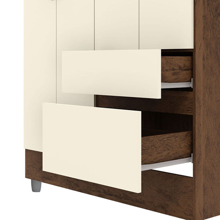 Este modelo incluye dos cajones que ofrecen un espacio adicional para mantener tus pertenencias ordenadas. Además, cuenta con un espacio específico para calzado y barrales que facilitan la organización de tus prendas. Las correderas telescópicas permiten un uso suave y eficiente, haciendo que cada apertura sea una experiencia agradable.
