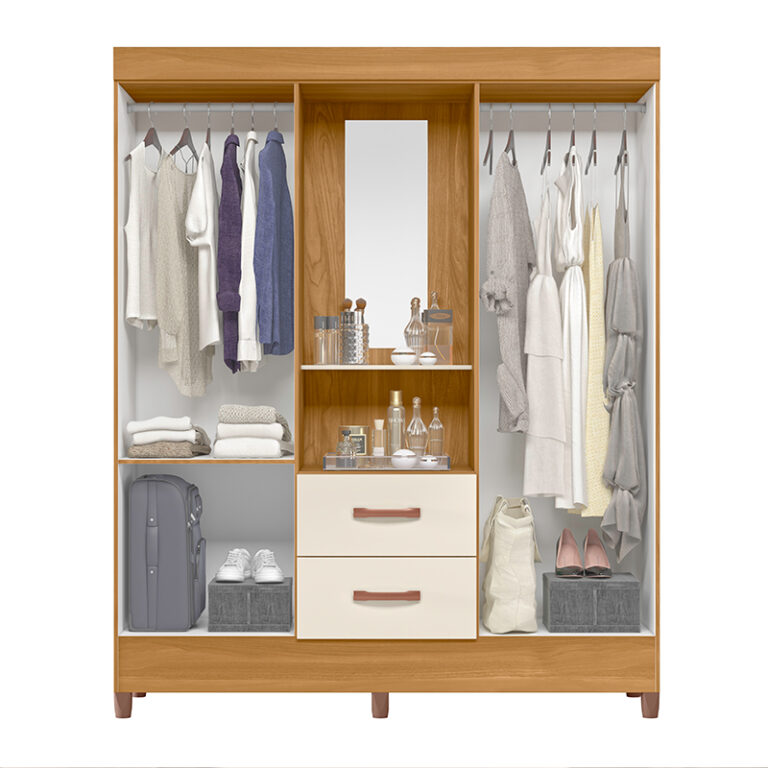 Closet fabricado en aglomerado MDP con terminación en pintura UV acabado símil madera y color off white. Posee 4 puertas y 2 cajones, con manillas de pvc color champagne y en su interior 2 barras para colgar además de una repisa. Incluye 4 patas que le dan altura y además facilitan la limpieza del piso. Visible al exterior, tendrás un espejo con 2 compartimentos para dejar a mano las cosas que utilizas a diario o decoración para personalizar tu closet.
