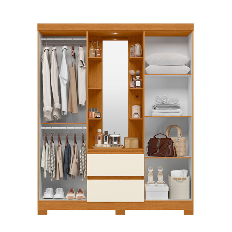 Uno de los principales atributos del Closet Olimpia 4P 2C es su espejo incorporado, ideal para facilitar tu rutina diaria sin necesidad de un espejo adicional. Este detalle no solo aporta comodidad, sino que también ayuda a ampliar visualmente el espacio y mejorar la iluminación del dormitorio.