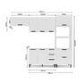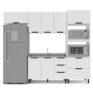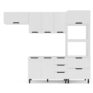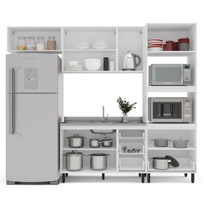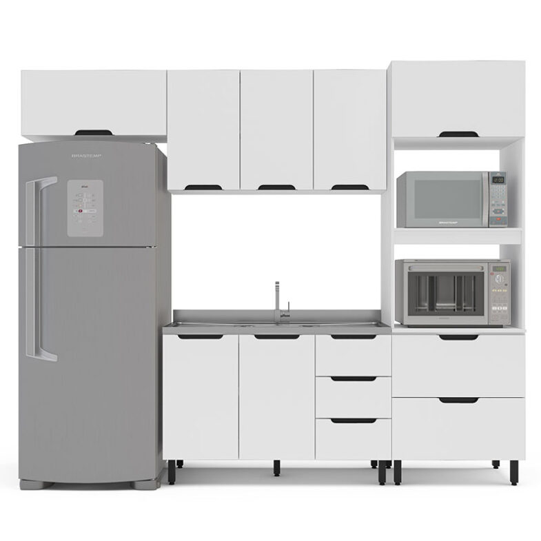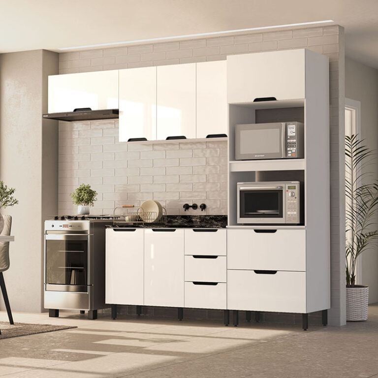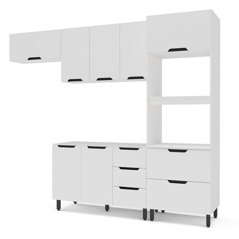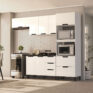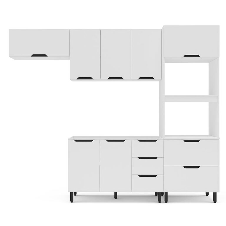 Este modelo se compone de módulos aéreos y de piso, ideales para guardar utensilios, vajilla, alimentos y electrodomésticos pequeños, todo con un diseño moderno y líneas limpias.