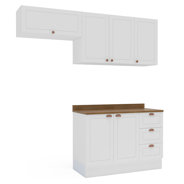 Su diseño incluye puertas con molduras y tiradores tipo cobre, junto a una cubierta tipo madera natural que aporta calidez y un estilo acogedor a tu cocina.
