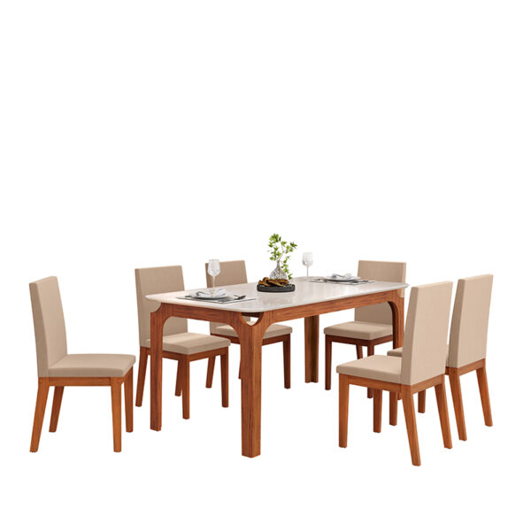 El Comedor Marina Suzy 6S combina diseño elegante, base de madera y sillas tapizadas que aportan comodidad y estilo para compartir momentos en familia.