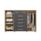 Organiza tu dormitorio con esta cómoda moderna de 6 cajones y 2 puertas, diseñada para ofrecer amplio almacenamiento con un estilo elegante en tonos gris y madera.