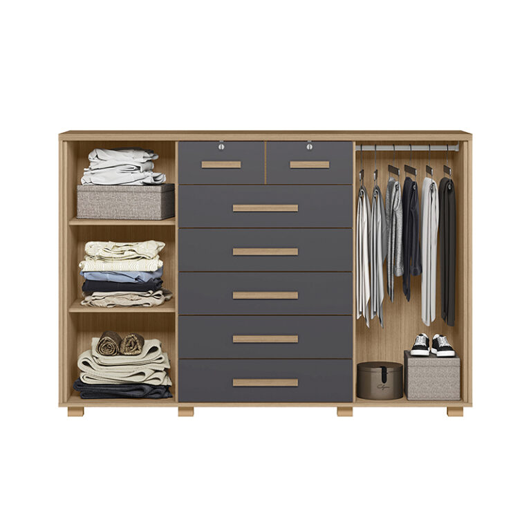 La cómoda de 6 cajones y 2 puertas es la solución perfecta para quienes buscan mantener su dormitorio ordenado sin perder el estilo. Su diseño moderno combina el elegante color gris con detalles en tono madera, logrando un equilibrio visual sofisticado que se adapta a diferentes tipos de decoración, desde ambientes minimalistas hasta espacios contemporáneos.