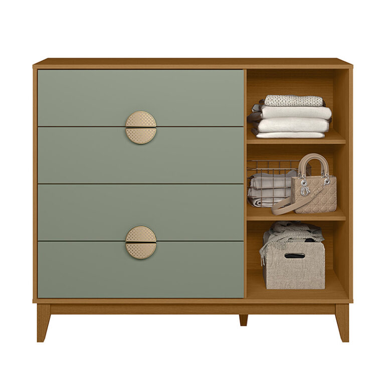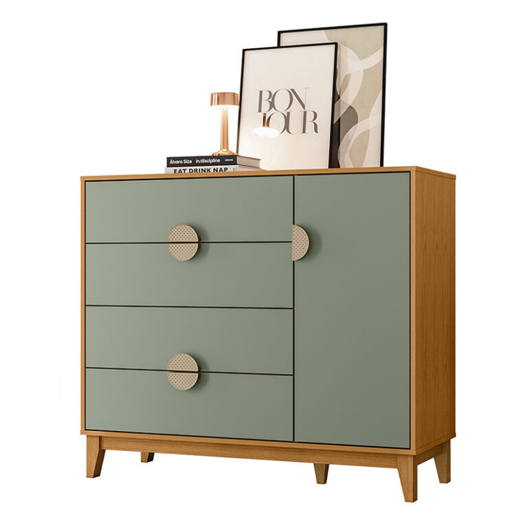La Cómoda Ipe Salvia 1p y 4c Vekka es un mueble moderno y elegante que se adapta a cualquier estilo de decoración. Con una altura de 101 cm, ancho de 120 cm y profundidad de 47 cm, ofrece un amplio espacio de almacenamiento. Cuenta con 4 cajones de MDP y 1 puerta con correderas telescópicas de metal para un fácil acceso. Además, incluye 5 estantes para organizar tus pertenencias de manera ordenada.