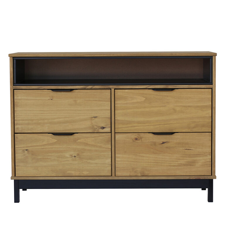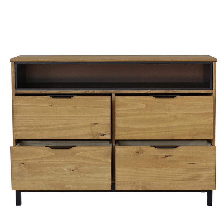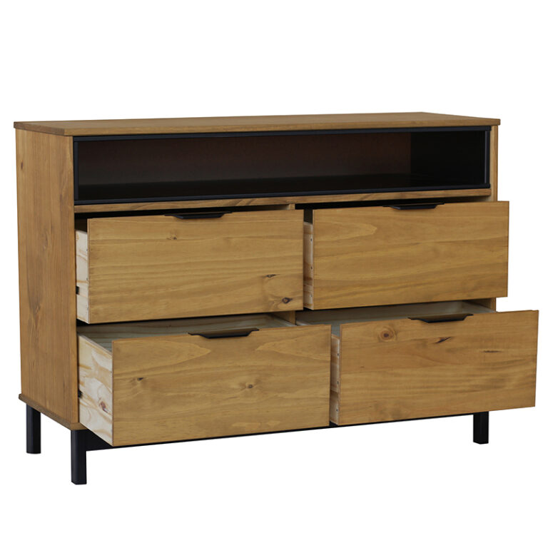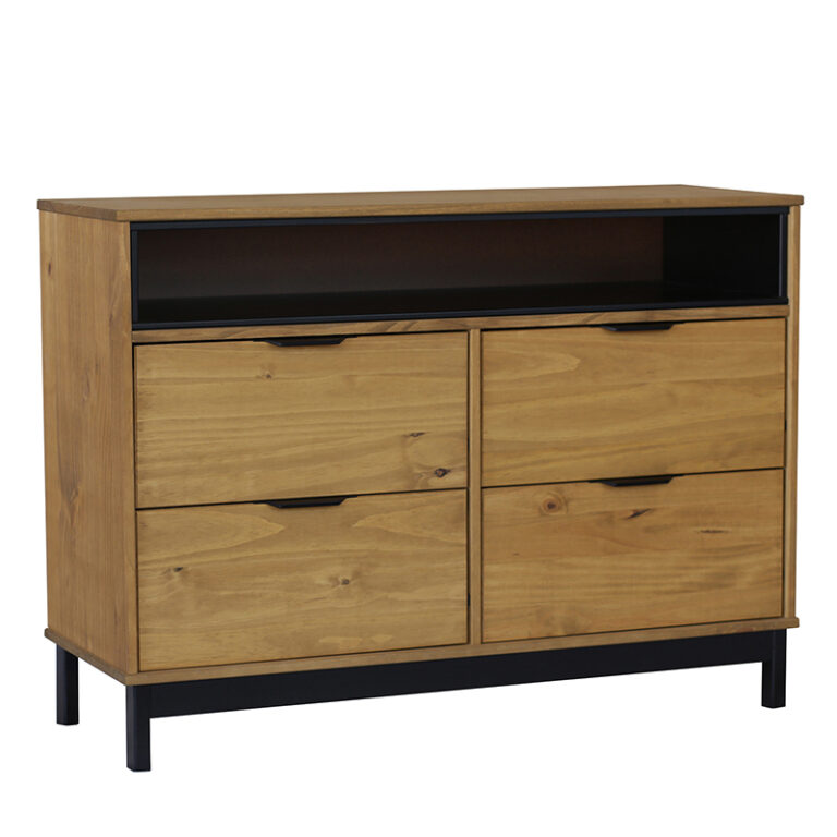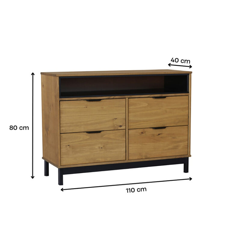 La cómoda Iris de la marca Vekka es el complemento perfecto para tu hogar. Con su estilo retro/vintage, le dará un toque de elegancia y personalidad a cualquier habitación. Fabricada con madera maciza de pino, garantiza durabilidad y resistencia. Sus 4 cajones ofrecen amplio espacio de almacenamiento para organizar tus pertenencias de manera ordenada.
