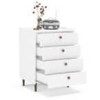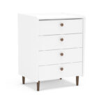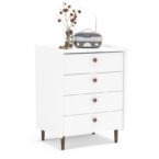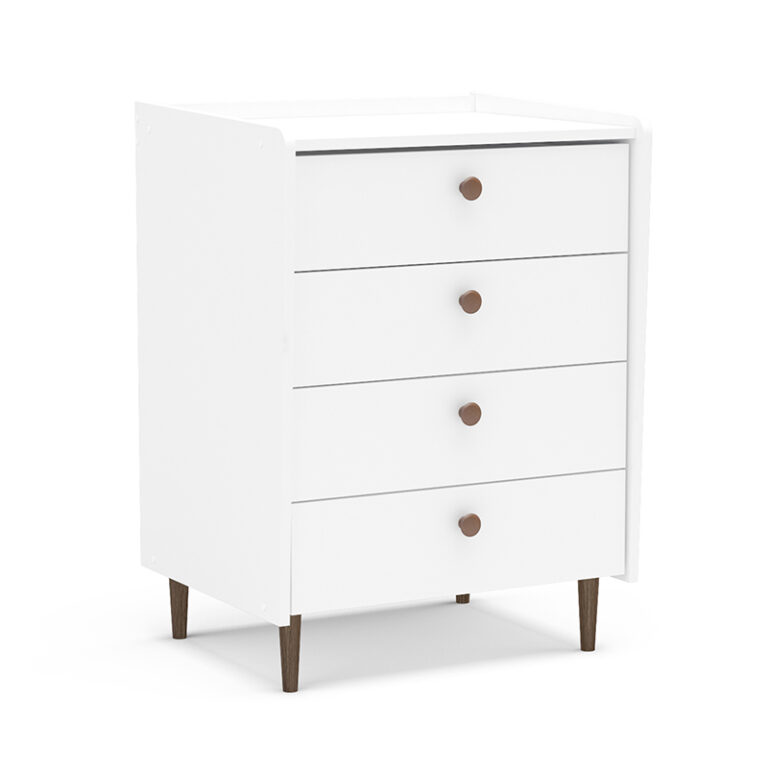 Cómoda fabricada en MDP con terminación en pintura UV color blanco. Estacómoda posee 4 cajones con tiradores color café a juego con sus patas de madera, además de zócalo en la cubierta para evitar la caída de objetos que dejes en ella. Su diseño es perfecto para quienes aman el estilo romántico.