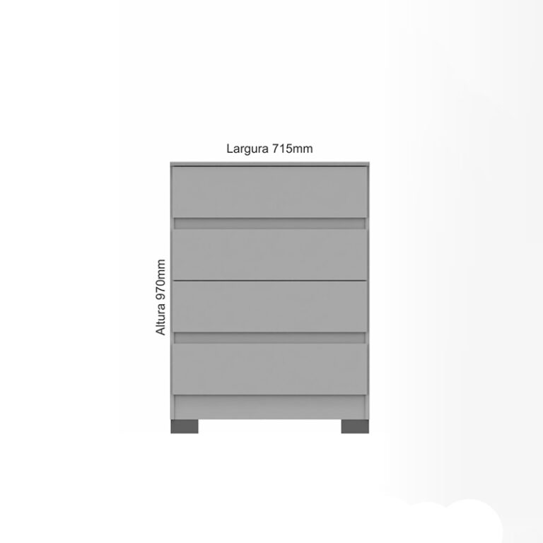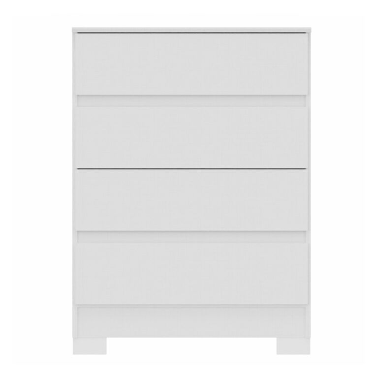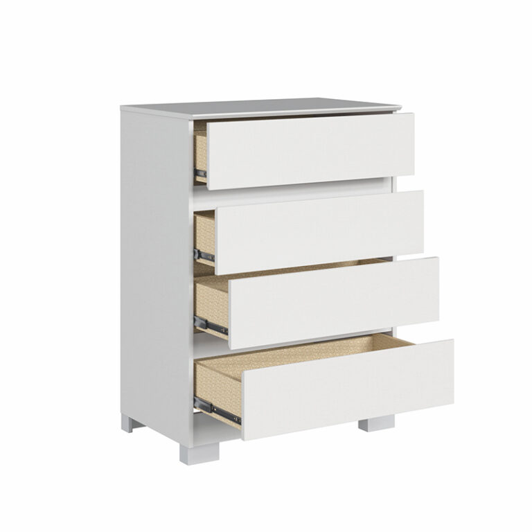 Cómoda Maia 4 cajones, estrucutra en MDP, cubierta en Pintura UV y patas en ABS. Es ideal para no usar un espacio gigante, pero tener buena capacidad de organización. Aparte tiene un dieseño fácil de combinar en cualquier habitación