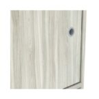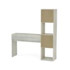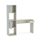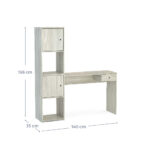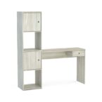 Escritorio fabricado en MDP con terminación en pintura UV, que le otorga un acabado símil madera. Posee un cajón y un estante lateral con 2 repisas y 2 compartimientos con puertas, bisagras metálicas y manillas de PVC. Su distribución