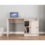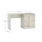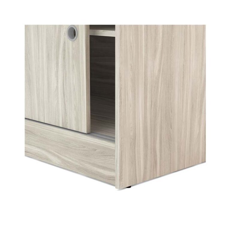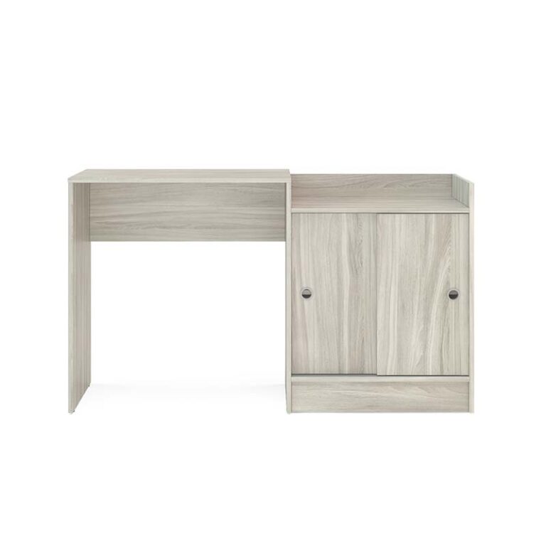 Escritorio fabricado en MDP con terminación en pintura UV, lo que le otorga un acabado símil madera. La cubierta posee dos niveles y cuenta con un compartimiento con puertas correderas y repisa interior. Es un escritorio práctico, ideal para mantener la organización y orden en el espacio de trabajo.
