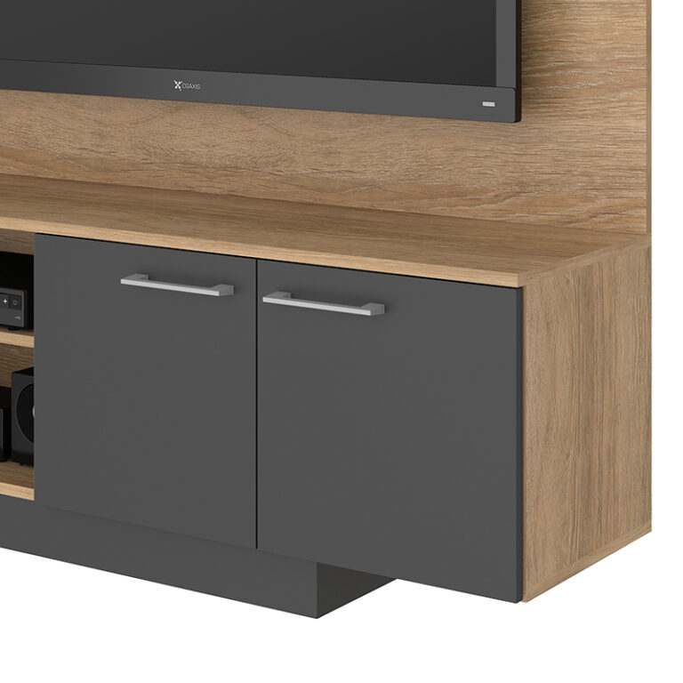 Home TV de estructura de MDP color café para TV de 55”. Cuenta con 2 puertas, además de múltiples repisas y compartimientos para mayor funcionalidad.