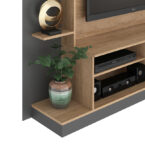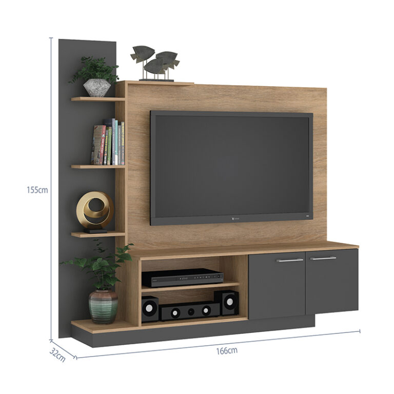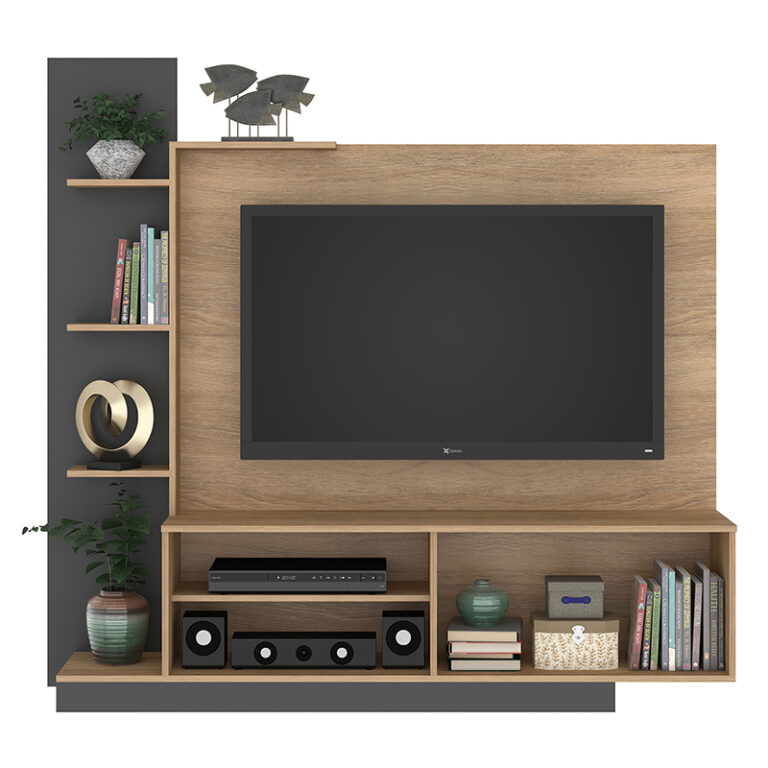 Este mueble incorpora un amplio panel central ideal para televisores, permitiendo una instalación limpia y estética, mientras que sus compartimentos abiertos y cerrados ofrecen el espacio perfecto para organizar dispositivos electrónicos, decoración y accesorios.