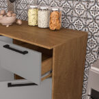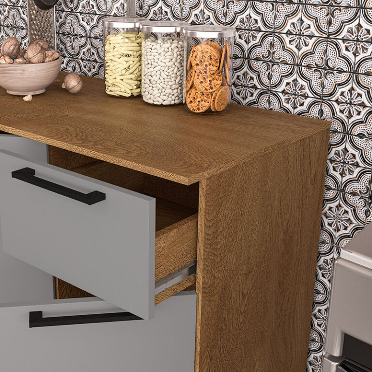Fabricada con materiales de alta calidad como el MDP, esta cocina garantiza durabilidad y resistencia en el uso diario. Los tiradores de plástico y las correderas telescópicas aseguran un funcionamiento suave y cómodo en cada apertura y cierre. Además, incluye una mesada para facilitar tus tareas culinarias.