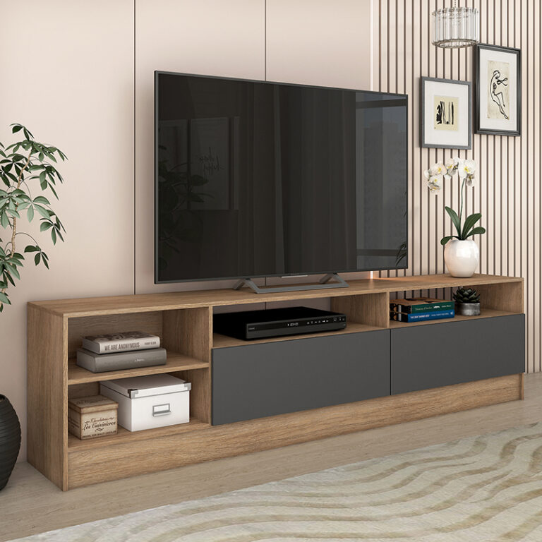 Rack Moyan de estructura en MDP con terminación en pintura UV de acabado símil madera. Capacidad para televisores de hasta 75″, posee 2 puertas abatibles y 4 compartimientos a la vista, para poder organizar todos tus complementos de tv y decoración para darle estilo y a tu sala de estar.