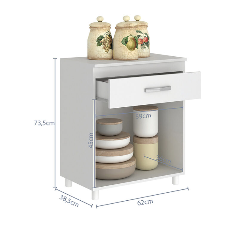 El estilo clásico de este mueble de cocina se adapta a cualquier decoración, brindando un toque de sofisticación a tu hogar. Con unas dimensiones de 73.5 cm de alto, 62 cm de ancho y 38.5 cm de profundidad, ofrece un amplio espacio de almacenamiento para utensilios y alimentos. Requiere ensamblado, pero su montaje es sencillo y rápido.