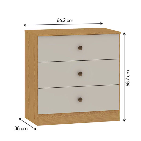 La cómoda incluye 3 cajones amplios, perfectos para ropa interior, poleras, accesorios o artículos personales.