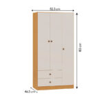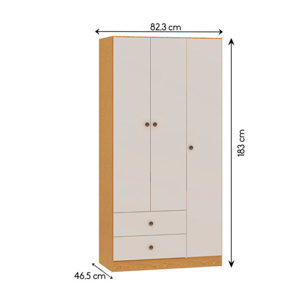 El closet cuenta con 3 puertas y 2 cajones inferiores, ofreciendo espacio suficiente para colgar prendas, organizar ropa doblada y guardar accesorios.