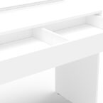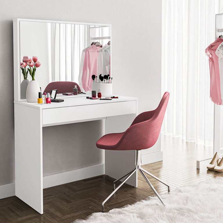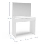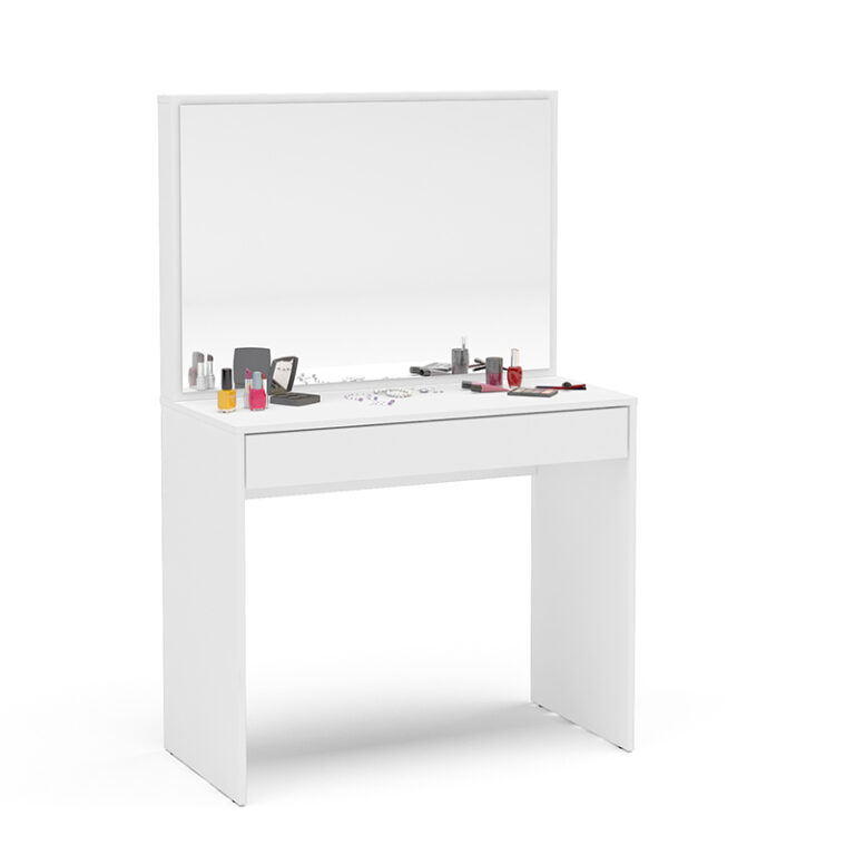 Tocador Virginia fabricado en aglomerado MDP color blanco con 0,15 cm de espesor. Posee 1 cajón y 1 espejo. De diseño simple y tamaño óptimo para espacios reducidos, tendrás el espacio perfecto para tus sesiones de maquillaje, rutinas de skincare o peinados.