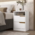 Con una altura de 65 cm y un ancho de 45 cm, este velador ofrece espacio suficiente para colocar una lámpara, libros o cualquier otro objeto que desees tener a mano. Su material de MDP garantiza resistencia y durabilidad, mientras que los estantes internos te permiten organizar tus pertenencias de forma ordenada. Perfecto para quienes buscan calidad y estilo en un solo mueble.
