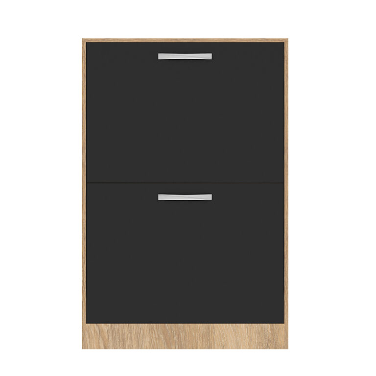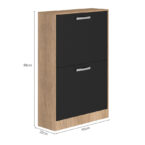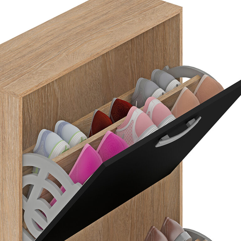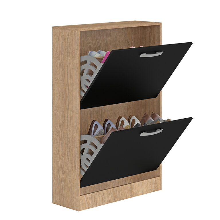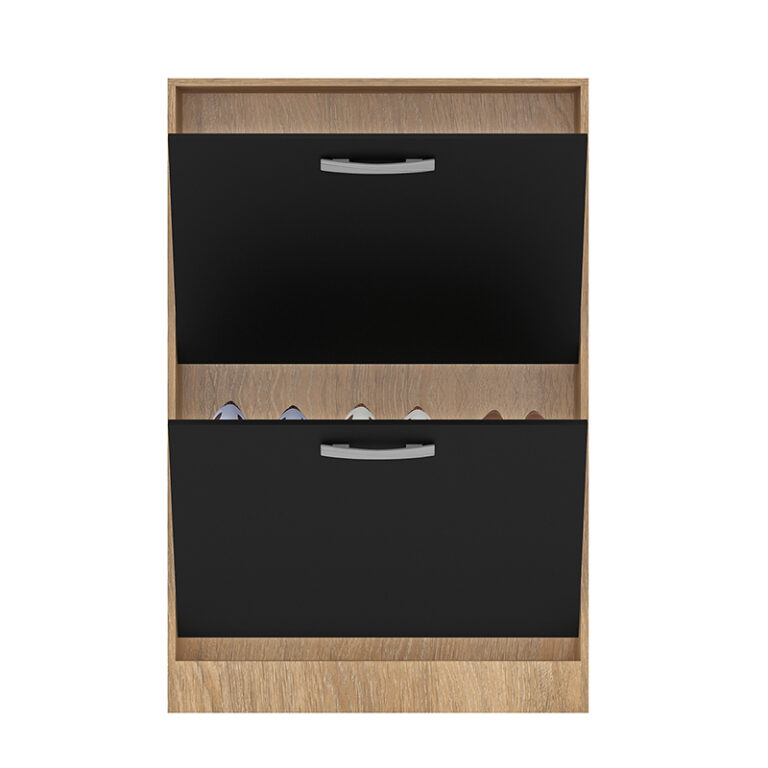 Zapatera fabricada en aglomerado MDP con terminación en pintura UV, símil madera. Posee 2 puertas levadizas con 1 separador interno y abanico interior. Capacidad para 12 pares de zapatos