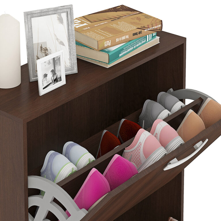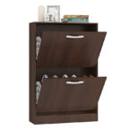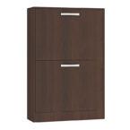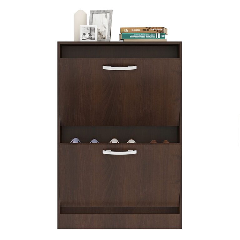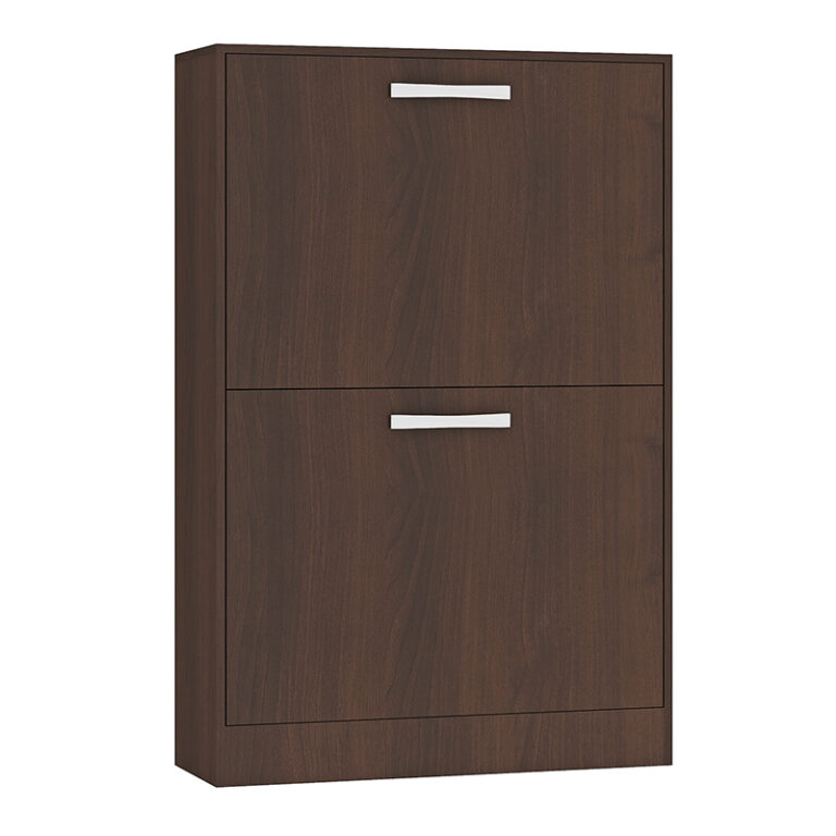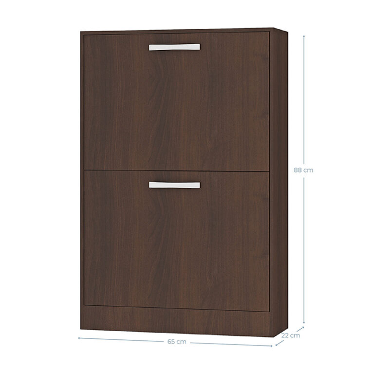Zapatera fabricada en aglomerado MDP con terminación en pintura UV, símil madera. Posee 2 puertas levadizas con 1 separador interno y abanico interior. Capacidad para 12 pares de zapatos.