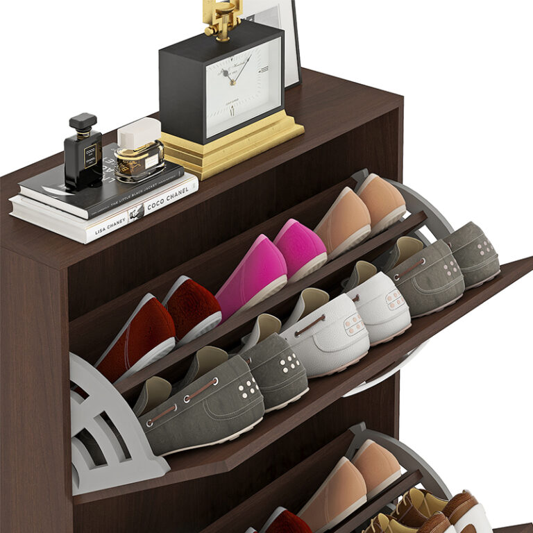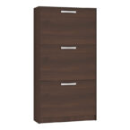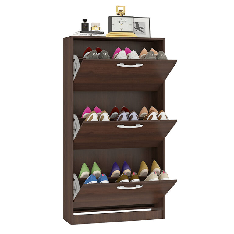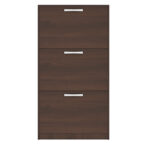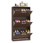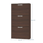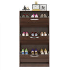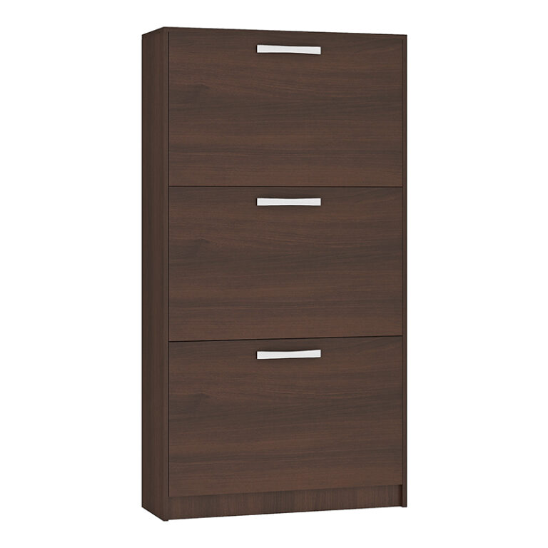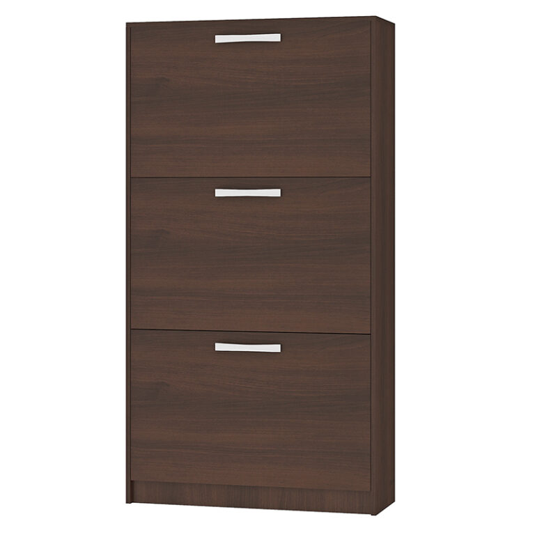 Zapatera fabricada en aglomerado MDP con terminación en pintura UV, símil madera. Posee 3 puertas levadizas con 1 separador interno y abanico interior. Capacidad para 18 pares de zapatos.
