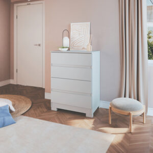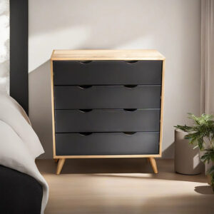 Cómoda Maia 4 cajones, estrucutra en MDP, cubierta en Pintura UV y patas en ABS. Es ideal para no usar un espacio gigante, pero tener buena capacidad de organización. Aparte tiene un dieseño fácil de combinar en cualquier habitación
