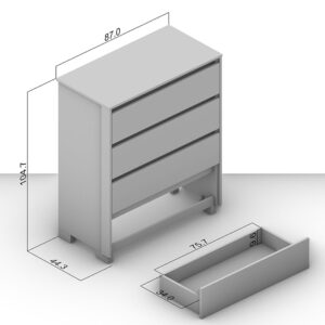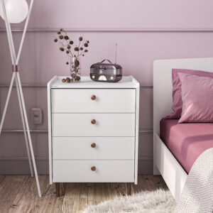 Cómoda fabricada en MDP con terminación en pintura UV color blanco. Estacómoda posee 4 cajones con tiradores color café a juego con sus patas de madera, además de zócalo en la cubierta para evitar la caída de objetos que dejes en ella. Su diseño es perfecto para quienes aman el estilo romántico.