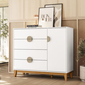 La Cómoda Ipe Salvia 1p y 4c Vekka es un mueble moderno y elegante que se adapta a cualquier estilo de decoración. Con una altura de 101 cm, ancho de 120 cm y profundidad de 47 cm, ofrece un amplio espacio de almacenamiento. Cuenta con 4 cajones de MDP y 1 puerta con correderas telescópicas de metal para un fácil acceso. Además, incluye 5 estantes para organizar tus pertenencias de manera ordenada.