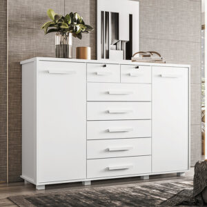 Esta impresionante cómoda de 7 cajones con 2 puertas en elegante color negro es la solución definitiva para tu necesidad de almacenamiento y estilo. Sus amplios cajones te permiten organizar tu ropa y accesorios con facilidad, mientras que las puertas esconden compartimentos adicionales para un espacio ordenado.