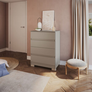 Cómoda Maia 4 cajones, estrucutra en MDP, cubierta en Pintura UV y patas en ABS. Es ideal para no usar un espacio gigante, pero tener buena capacidad de organización. Aparte tiene un dieseño fácil de combinar en cualquier habitación
