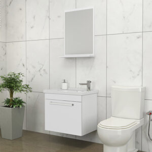 Mueble aereo para baño SAFIRA blanco con lavamanos de mármol sintético y espejo con repisa*NO INCLUYE GRIFERIA