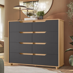 Cómoda fabricada en aglomerado MDP con terminación en pintura UV. Posee 8 cajones, con tiradores fabricados en la misma estructura. Incluye 5 patas que le dan altura y además facilitan la limpieza del piso. Ideal para organizar poleras o ropa interior. Diseño simple y elegante, se adapta a diversos estilos y combinará fácilmente en tu dormitorio.