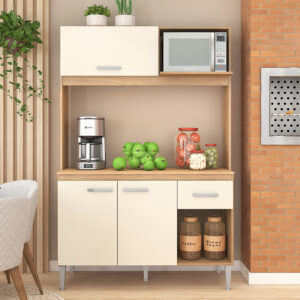 Optimiza tu espacio con este mueble de cocina multifuncional de diseño moderno y práctico. Con una altura total de 244 cm, ofrece amplios compartimientos distribuidos estratégicamente para adaptarse a electrodomésticos como hornos o microondas, así como utensilios y accesorios de cocina.